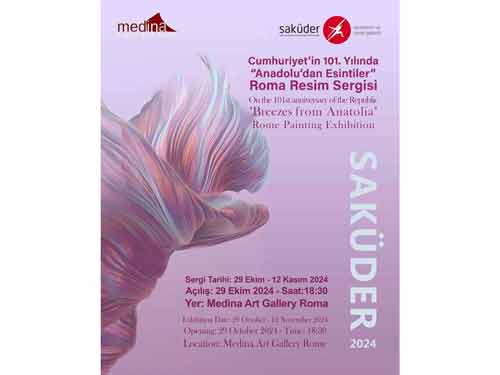 In occasione della celebrazione del 101? anniversario dalla nascita della Repubblica di Turchia, la Galleria Saku?der inaugurerà la mostra di pittura "Brezze dall'Anatolia" presso Medina Art Gallery di Roma il 29 ottobre 2024 alle ore 18:30. Saranno esposti i lavori di 20 artisti pittori. Artisti e appassionati d'arte residenti a Roma sono invitati sin da ora al cocktail di inaugurazione alla presenza della stampa.