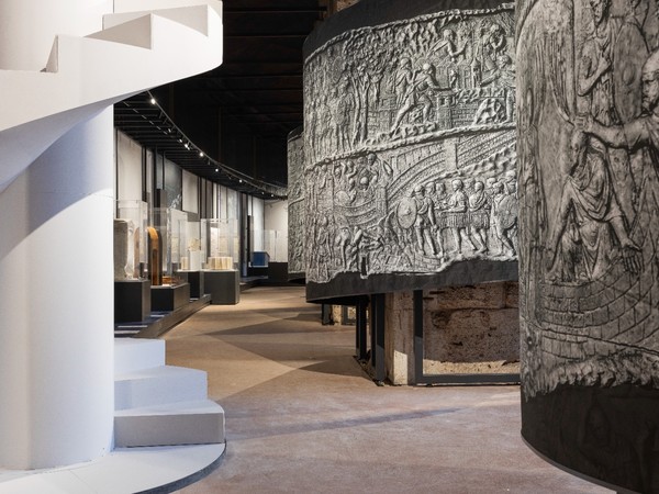 L’allestimento narra e spiega questa funzione simbolica con due registri narrativi: quello più propriamente storico e artistico, con l’ardita ricostruzione del fregio in scala 1:1 le cui spire si avvolgono sui pilastri del Colosseo, separate nel racconto della Prima e Seconda Guerra Dacica dalla Vittoria che scrive sullo scudo riprodotta nel calco dei Musei Vaticani; e quello invece più specificamente tecnico, con le tappe della lavorazione del marmo, fino ad arrivare alla idolatria e all’uso politico dei sovrani d’Europa che ne pretesero la riproduzione attraverso la tecnica della calcatura.